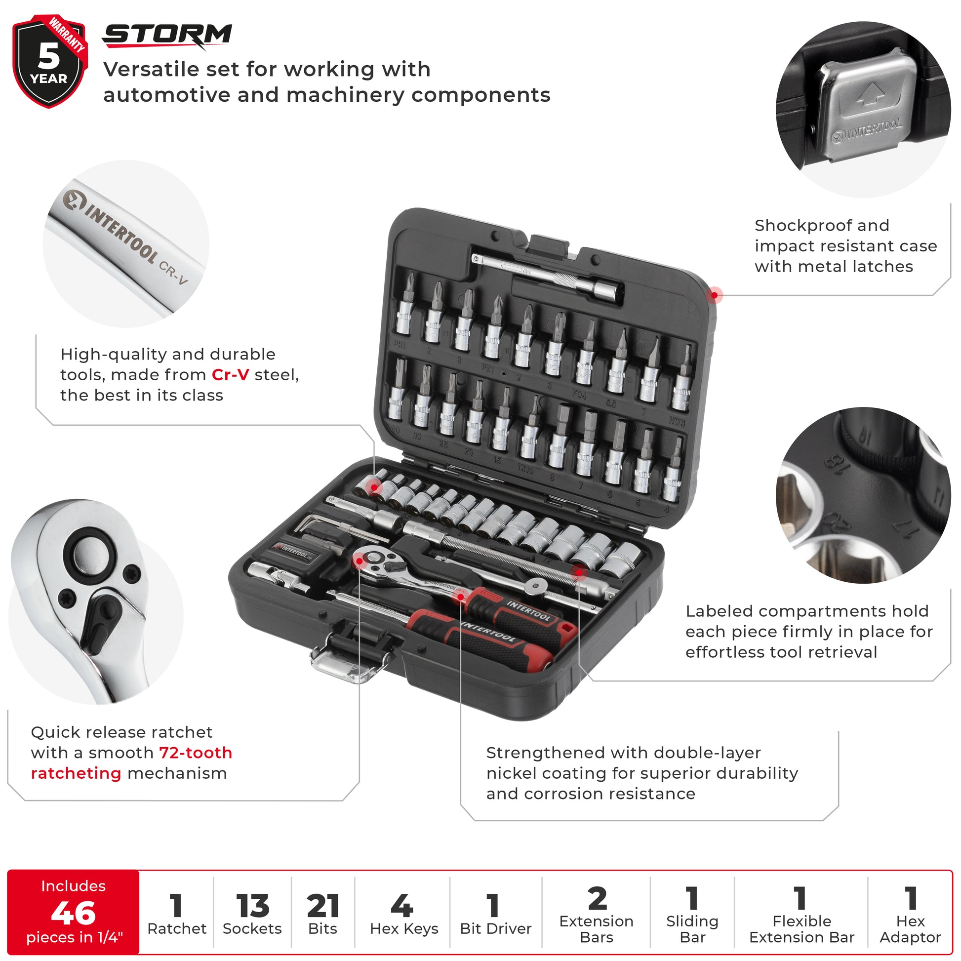 Juego de puntas y dados INTERTOOL con accionamiento de 1/4", sistema métrico, 46 piezas, estuche rígido compacto | ET08-8046