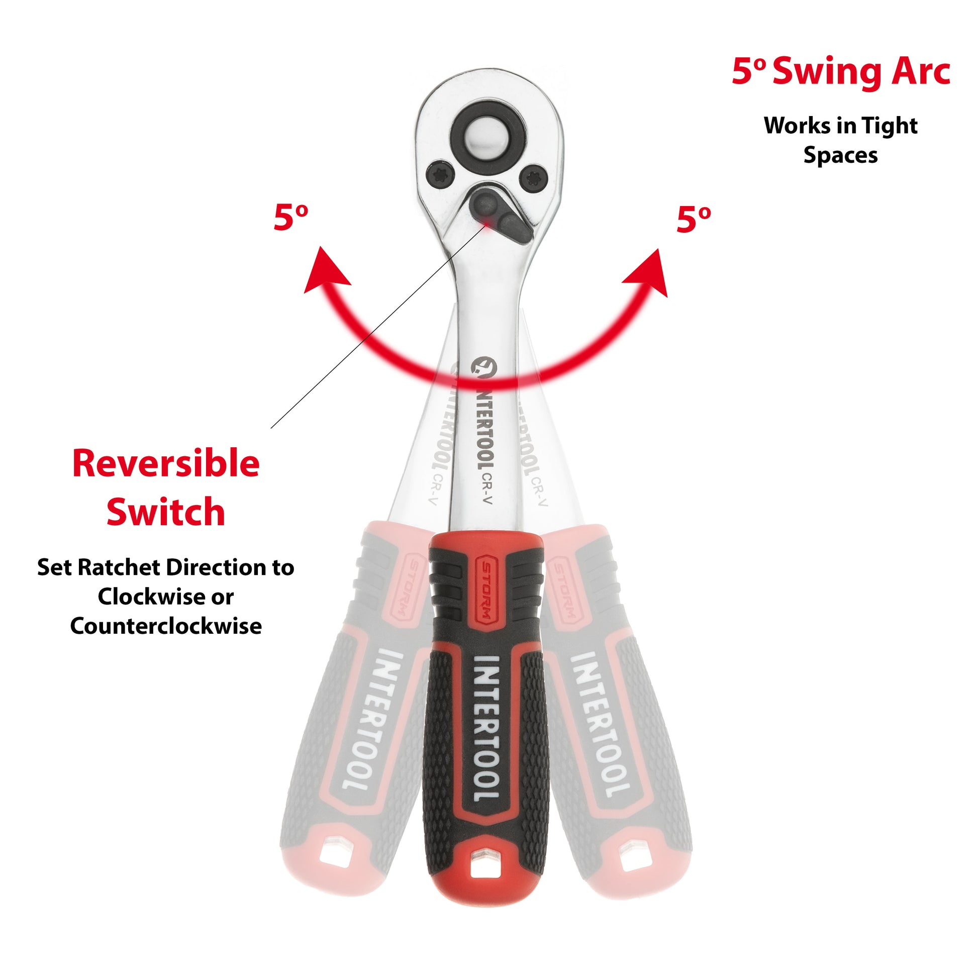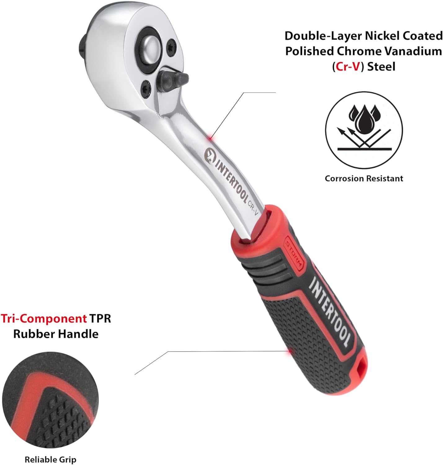 - [Ergonomic Design]: Ratchet wrench features an angled head and 3-component rubberized grip for improved comfort and control. Includes a shockproof case with inner foam diagram indicating all component sizes