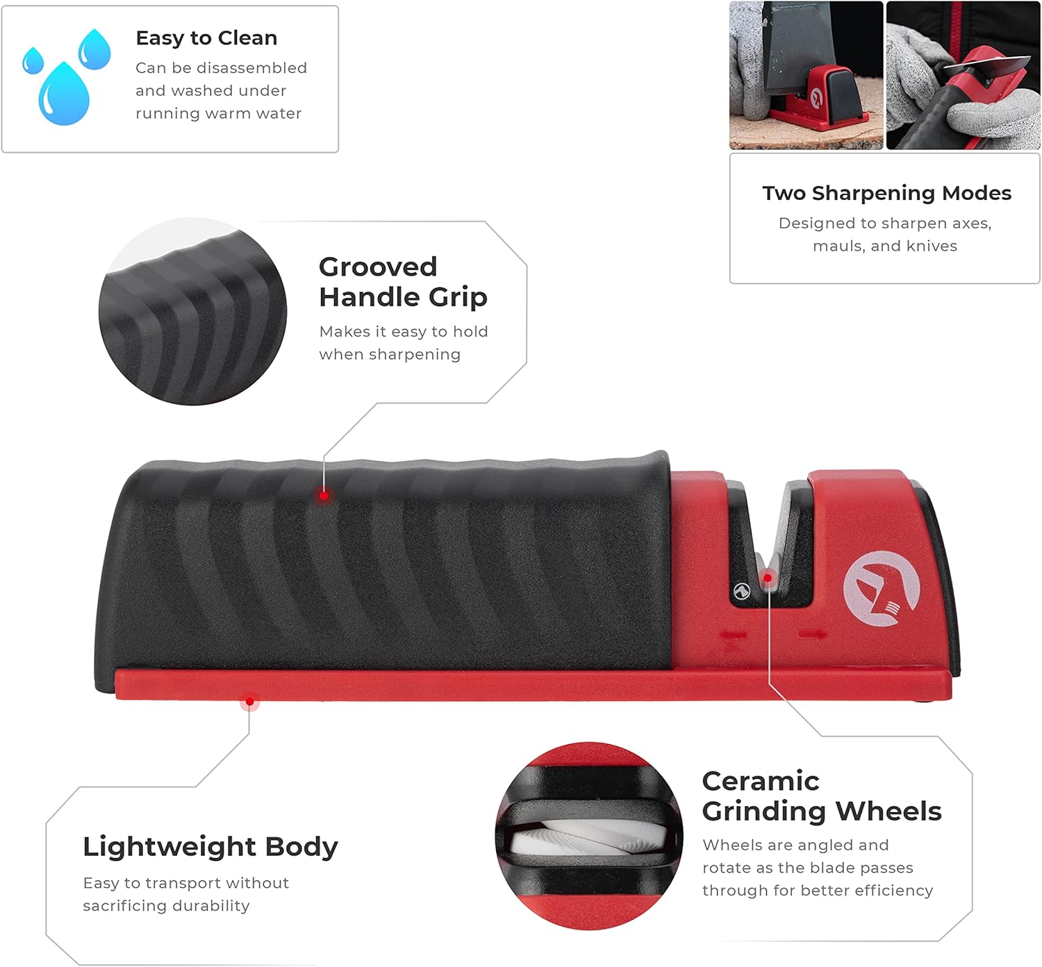 Features two angled slots specifically designed for sharpening axes and mauls, as well as knives and other blades. Suitable for both right- and left-handed users. -